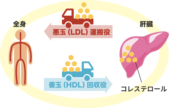 HDL(善玉)コレステロール HDLとは「High Density Lipoprotein」の略で高比重リポタンパクの意味です。全身に増えすぎたコレステロールや、血管壁にたまってしまったコレステロールを回収し、肝臓に戻す働きがあります。HDLコレステロールの高い方では血管の健康リスクが低くなることから「善玉コレステロール」と呼ばれています。