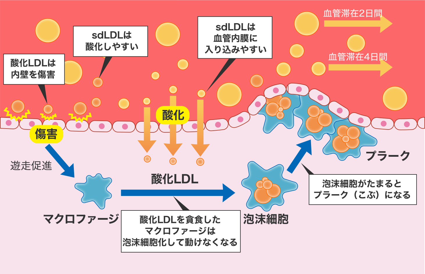 「酸化LDLコレステロール」 LDLが活性酸素などによって酸化されたものを酸化LDLと言います。酸化LDLは、血管壁を傷つけ、炎症を起こします。またLDLが酸化LDLになるとからだの免疫システムから異物と認識されるため、白血球の一種であるマクロファージが取り込んで処理しようとします。取り込んだ酸化LDLが多くなり処理しきれなくなるとマクロファージは泡沫細胞に変化し、動けなくなって、血管壁に“こぶ(=プラーク)”を作ります。このことから、血管健康リスクの直接的原因となる酸化LDLコレステロールこそが「真の悪玉コレステロール」であるとも言われています。